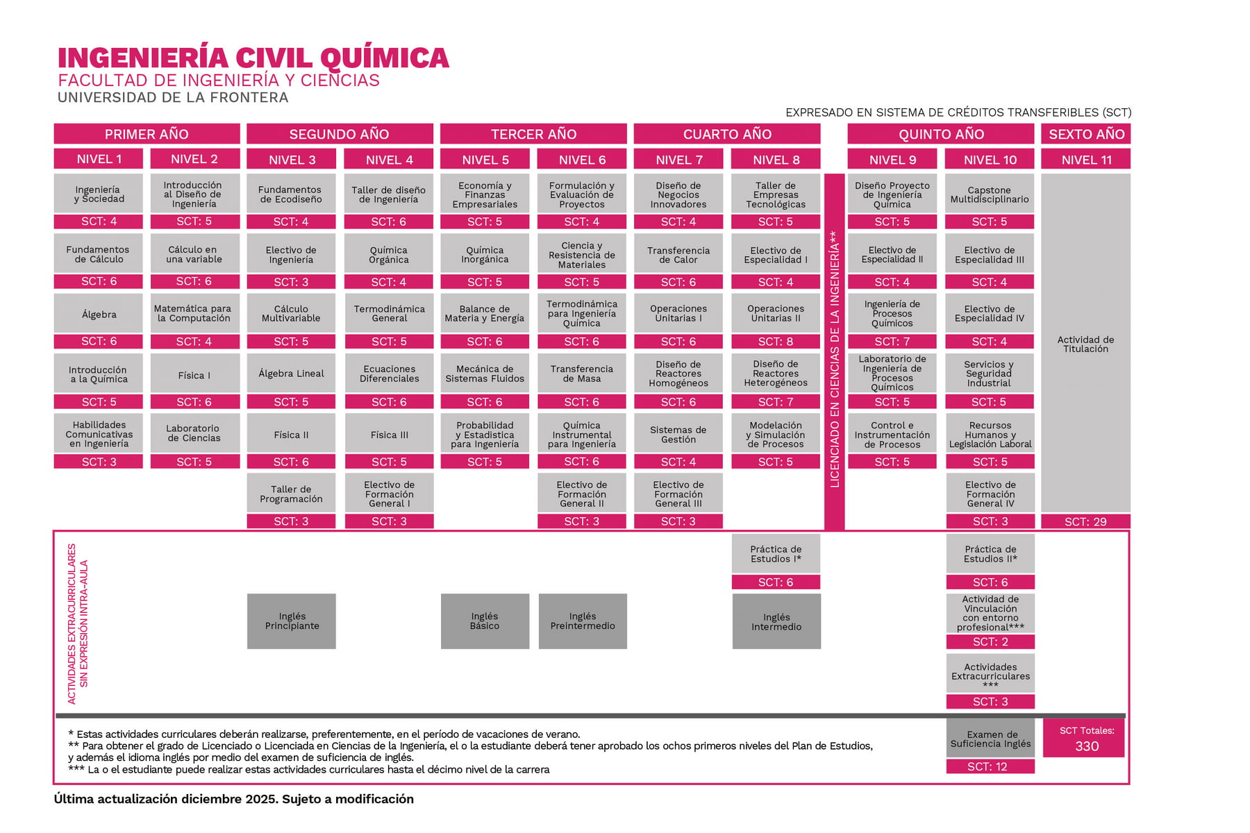 El Ingeniero(a) Civil Químico formado en la Universidad de La Frontera es un profesional con capacidades para desempeñarse en áreas de procesos productivos, proyectos y gestión, principalmente en los siguientes sectores económicos del país: Alimentos y bebidas, Energía, Minería, Refinería de petróleo y biomasa, Celulosa y papel, Plástico, Textil e Industria química (pinturas, polímeros, productos naturales, etc.).